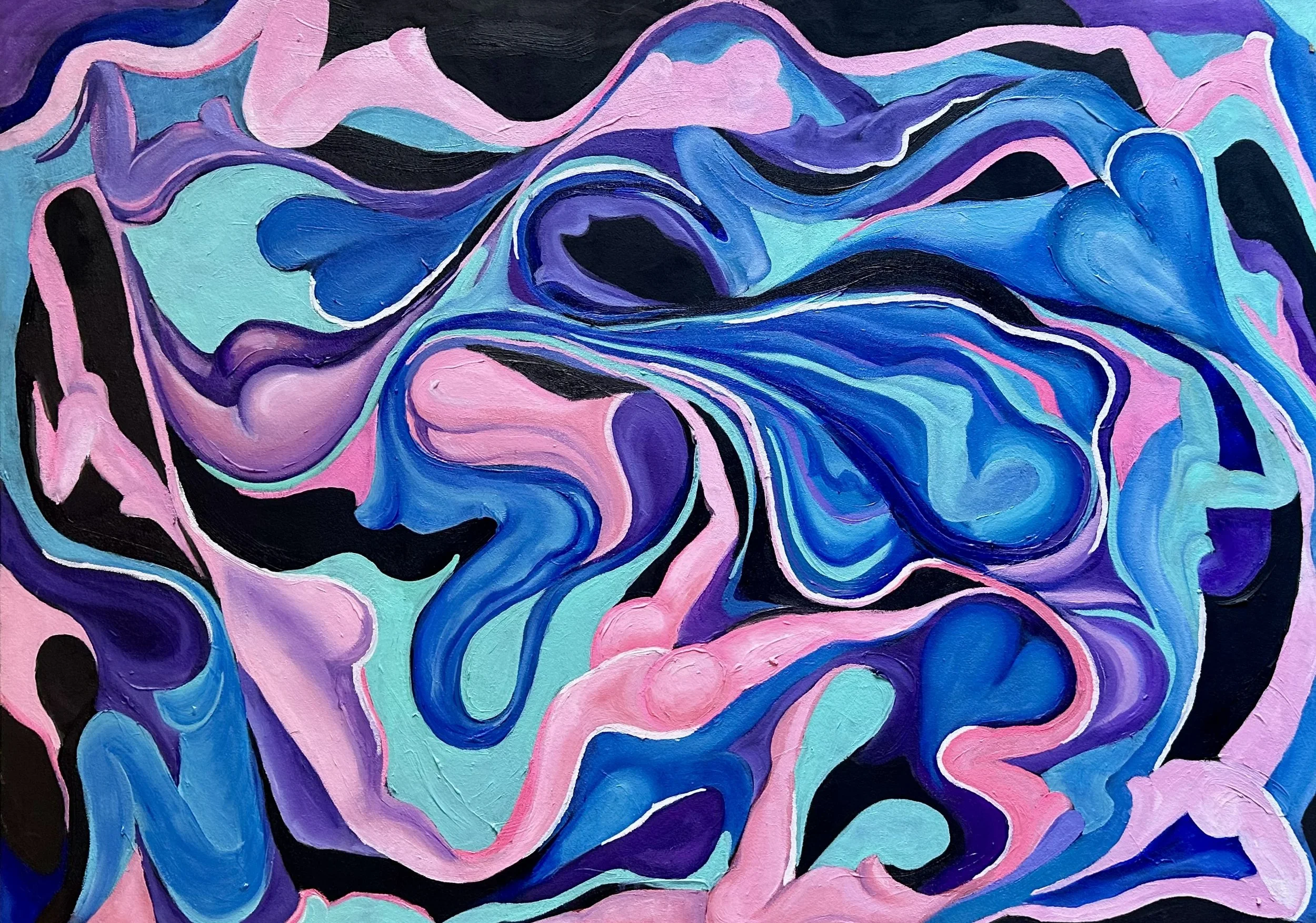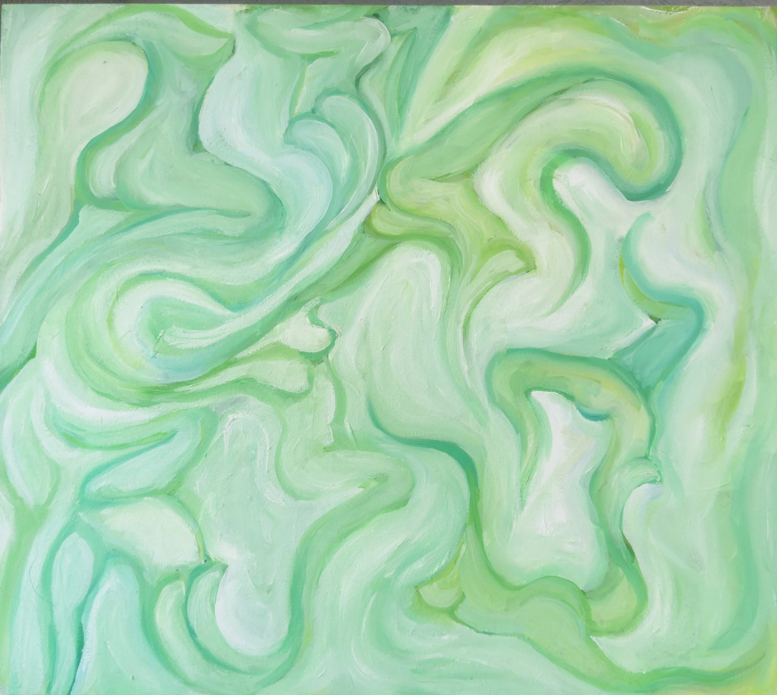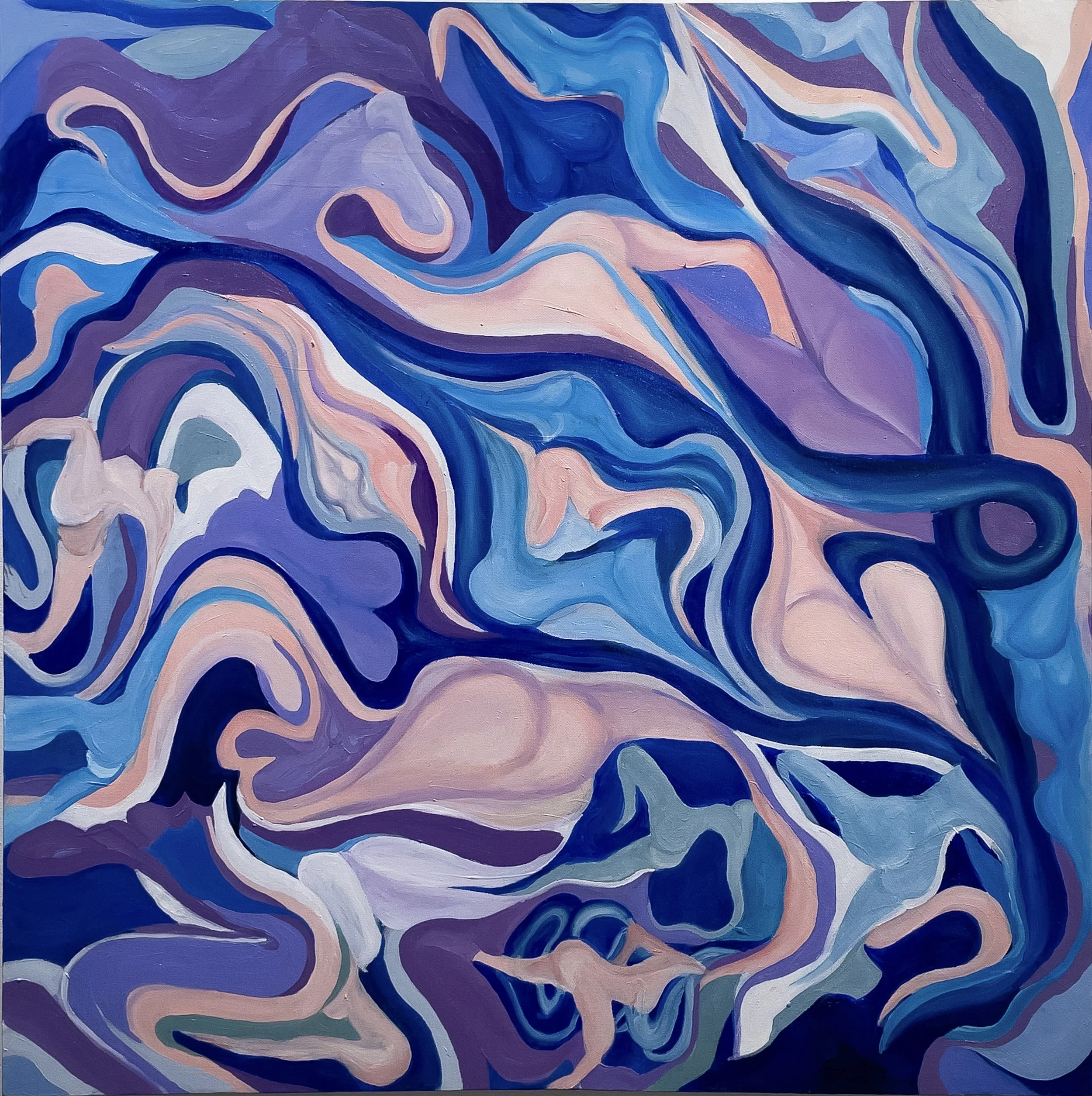The “Vertigo” series, inspired by the rhythmic flow of music, was the exploration of the connection between visual and audio art forms. Every piece is designed to hold the viewer's gaze and guide the eye around the canvas in a similar flow that is heard in music. The combination of melody and lyrics lead to a blend of abstraction and figuration in the subject matter. There were no preconceived expectations of how the pieces would turn out. I did not intentionally plan any part of any of the pieces but rather allowed the music to guide my creative choices in color, composition, brush manipulation, and brush size. This allowed each piece to be somewhat performative and majorly done in one sitting or two.
